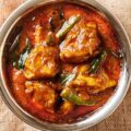Cooked with garlic, ginger and okra. Fairly hot