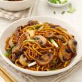 Stir-fried noodles with tender mushrooms and vegetables, seasoned with soy...