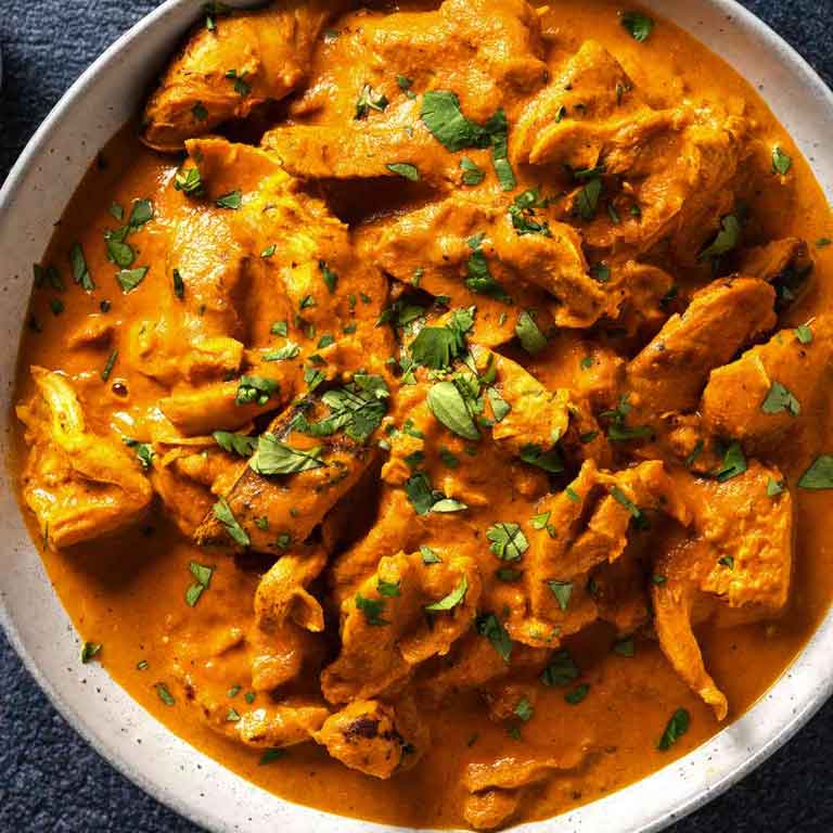 Juicy pieces of chicken tikka simmered in a creamy, spiced tomato sauce, offering a rich and flavorful curry experience.