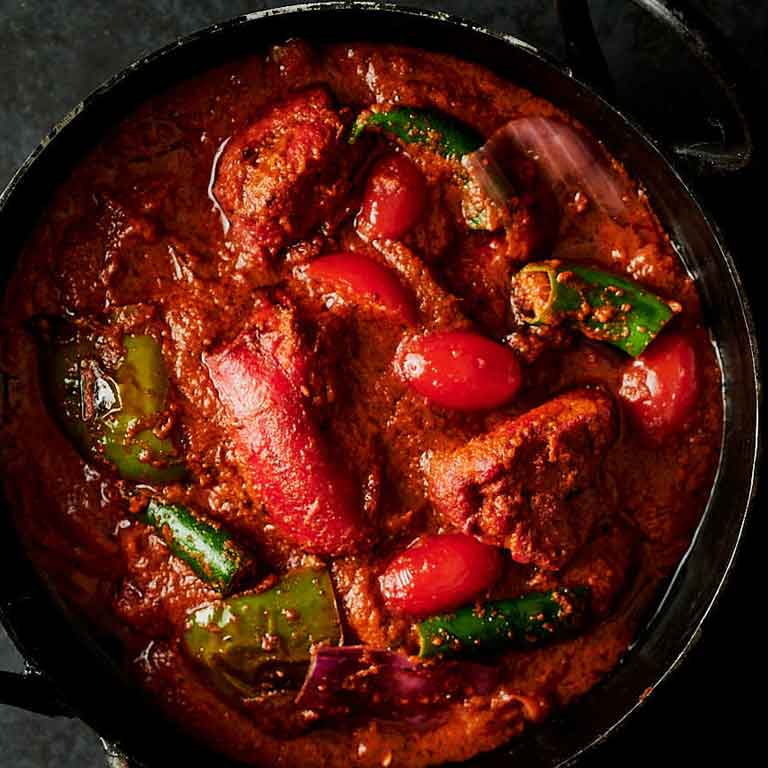 Tender lamb tikka pieces stir-fried with peppers, onions, and tomatoes in a spicy, tangy sauce for a rich, aromatic curry experience.