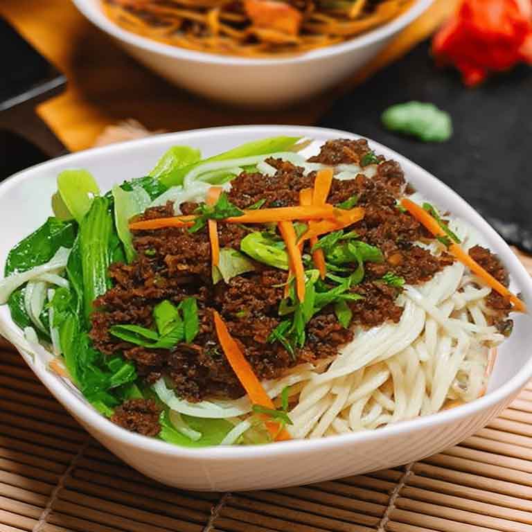 Savory stir-fried noodles with spiced minced meat (keema) and vegetables, cooked in a flavorful soy-based sauce for a delicious, hearty meal.