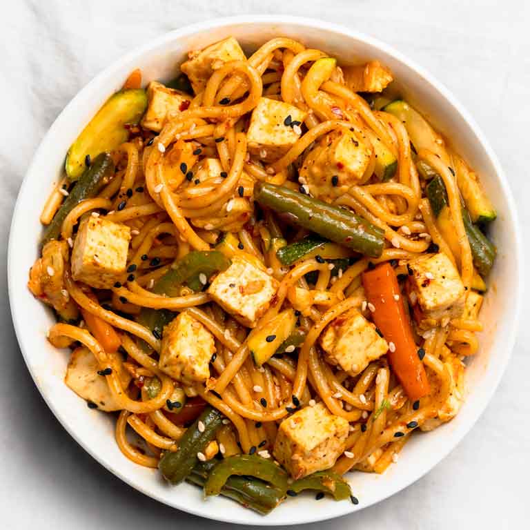 Stir-fried noodles with soft cubes of paneer and vegetables, seasoned with soy sauce for a rich, savory, and satisfying vegetarian dish.